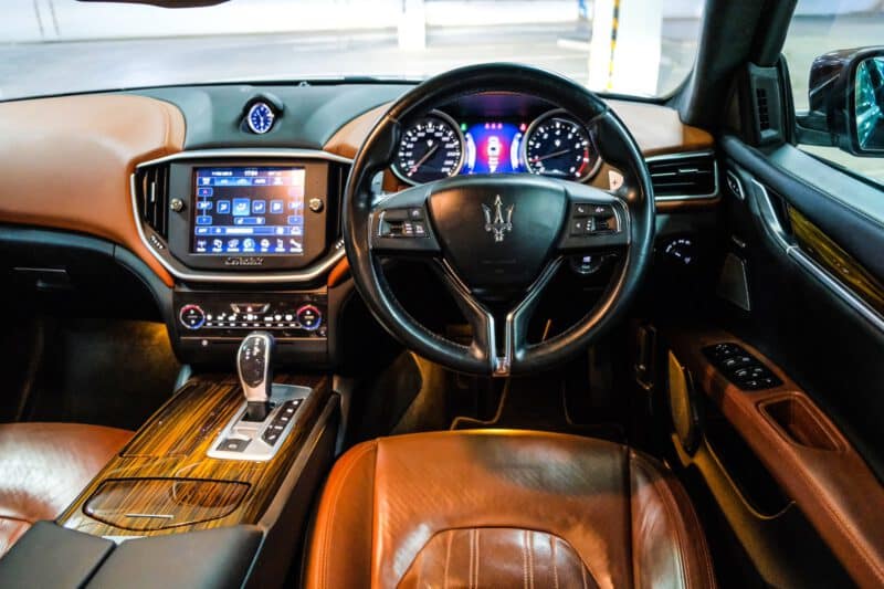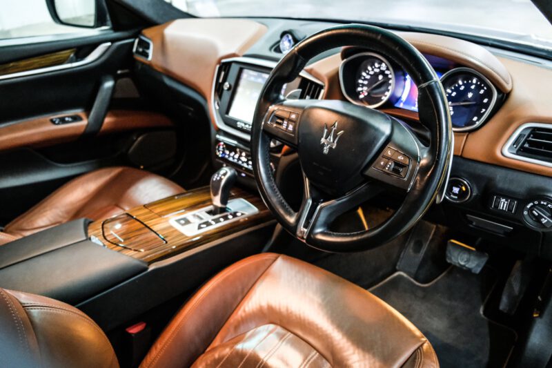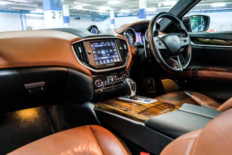 เมื่อมีโอกาสได้เช่ารถ Maserati Ghibli คันนี้ คุณจะได้สัมผัสกับงานออกแบบภายในอันปราณีต ด้วยเบาะหนังแท้สีน้ำตาลเข้ม อันเป็นเอกลักษณ์ของ Masersti พร้อมการตกแต่ง Trim ลายไม้วอลนัทแท้จากอิตาลี มีโลโก้ Ghibli ที่คอนโซลกลางบ่งบอกความเป็นตัวตน